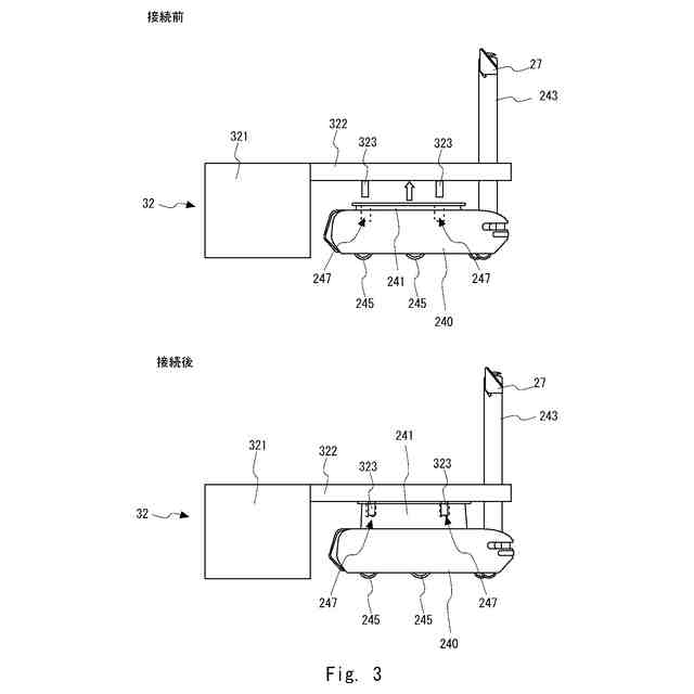 移動ロボット20は、自律移動ロボットであり、搬送、清掃、警備、案内などの複数のサービスを実行するものである。移動ロボット20は、病院、リハビリセンタ、介護施設、高齢者入居施設などの医療福祉施設、あるいはショッピングモールなどの商業施設等を自律移動する。移動ロボット20は、車輪、車台、モータ、センサ、バッテリ、コントローラなどを備える。移動ロボット20は、実行するサービスに応じて、ユニット31~34のいずれか一つを選択的に装着する。移動ロボット20は、同時に二つ以上の付属ユニット30を装着できるようになっていてもよい。移動ロボット20は、自身の動作のみで付属ユニット30を装着する構成、あるいはユーザ等が装着を補助する構成とする。