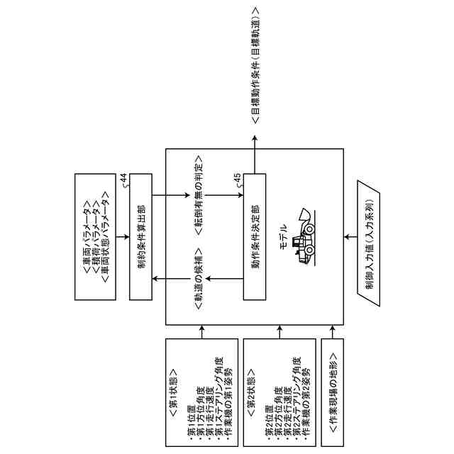 前記第1状態と前記第2状態と前記制御入力値とを前記作業機械のモデルに入力して、前記移動において前記作業機械が転倒しない制約条件を満足するように、前記第1位置から前記第2位置までの前記走行装置の目標走行条件及び前記作業機の目標作業条件を含む前記作業機械の目標動作条件を決定する動作条件決定部と、を有する、
