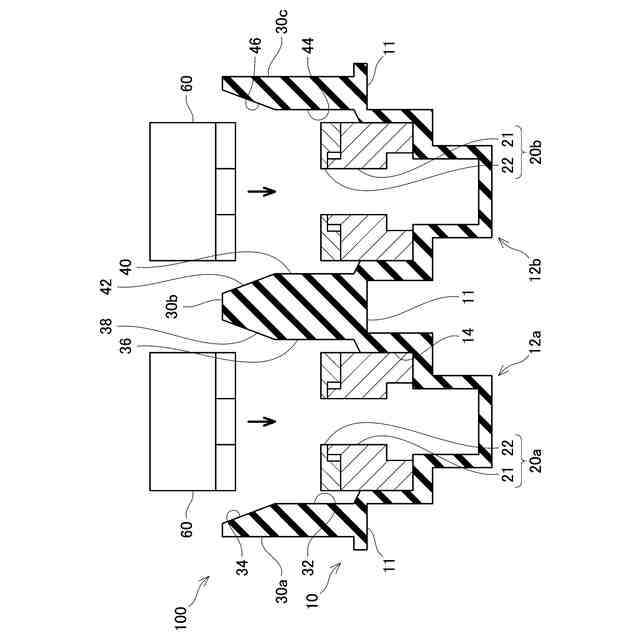 コネクタ100は、2つの接続端子20a、20bを有している。以下では、接続端子20a、20bをまとめて接続端子20という場合がある。各接続端子20は、対応する収容部12内に固定されている。接続端子20は、ナット21と接触端子22を有している。ナット21は、収容部12の側壁部14に沿って固定されている。接触端子22は、ナット21の上部に設けられている。接触端子22は、プレート部11よりも上側に設けられている。