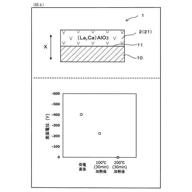 なお、基板上に、従来の無機化合物材料やフッ素系の有機高分子材料からなる薄膜又はそれら材料を組み合わせたエレクトレット膜を形成したエレクトレットが知られている。しかしながら、素子形成に用いられる一般的な無機化合物材料は、高い表面電位が得られず、フッ素系の有機高分子材料は、常温では、比較的高い表面電位を示すものの、耐熱性が低く、高温環境で用いられる素子への応用は難しい。