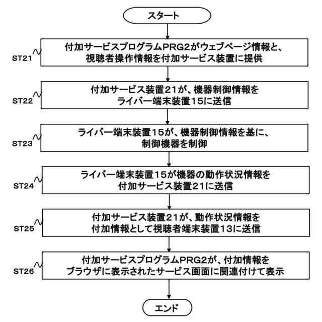 【解決手段】 ライブ配信サーバ11が提供するウェブページを視聴者端末装置13に表示する。視聴者端末装置13は、付加サービスプログラムPRG2により、ウェブページ情報を付加サービス装置21に提供すると共に、付加サービス装置21が生成した付加サービス情報に応じた付加サービス画面を表示する。付加サービス装置21は、視聴者端末装置13から受信した視聴者操作情報を基にライバー端末装置15に接続した制御機器を制御する。