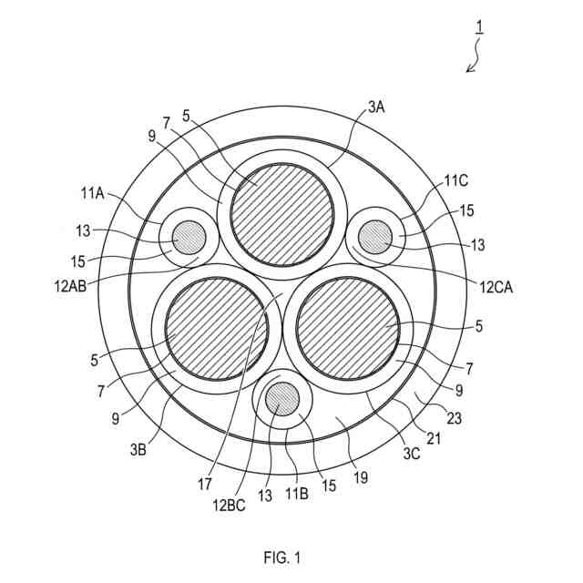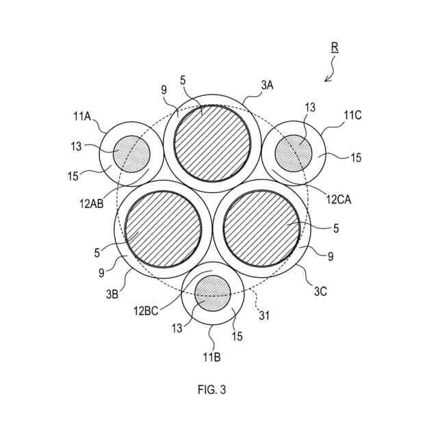 図1に示すように、ケーブル1は、3本の絶縁電線3A、3B、3Cを備える。ケーブル1の長手方向に直交する断面(以下では直交断面とする)において、絶縁電線3A、3B、3Cは、それらの中心が三角形を成すように配置されている。三角形は正三角形であってもよいし、正三角形でなくてもよい。