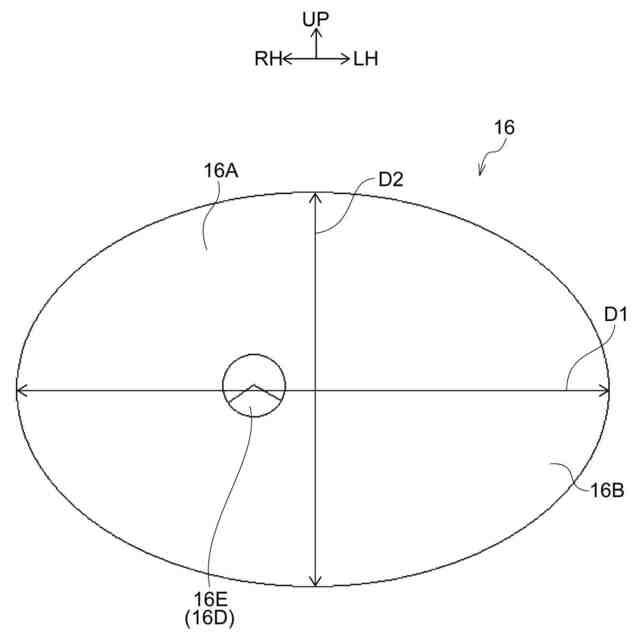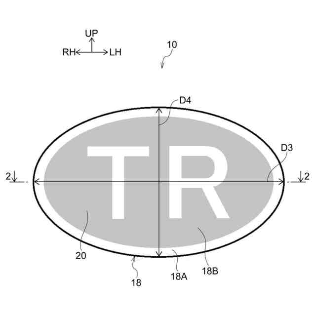 第3の態様のエンブレムは、第1の態様又は第2の態様のエンブレムにおいて、前記アウタレンズを正面から見て、前記アウタレンズの左右方向への最大寸法と上下方向への最大寸法とが互いに異なる寸法に設定されている。