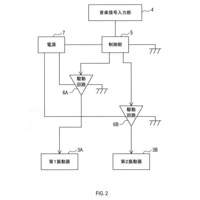 すなわち、当該構成要件は、利用者の身体に振動を付与するための振動付与器(3)と、音源から出力された音楽信号が入力される入力部(4)と、振動付与器(3)の作動を制御する制御部(5)であって、入力部(4)に入力された音楽信号に基づく振動波形(以下、音楽波形という。)に、効果を促すための振動波形(以下、基本波形という。)を加算した振動波形(以下、出力波形という。)にて当該振動付与器(3)を作動させることが可能な制御部(5)とである。