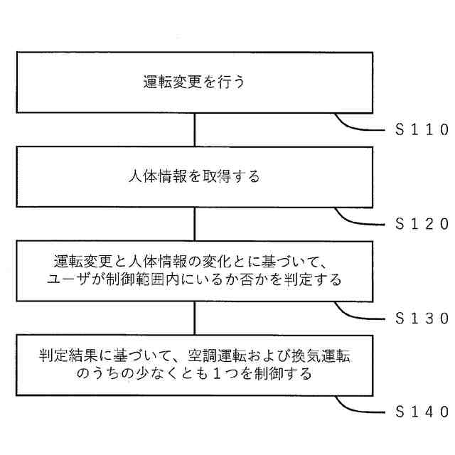 前記運転変更と、前記ユーザの体温、心拍数、および血中酸素濃度のうちの少なくとも1つの変化とに基づいて、前記ユーザが前記空気調和機の制御範囲内にいるか否かを判定し、