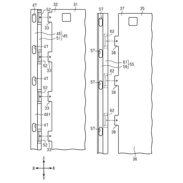 各ガイド部材において、互いに前記長さ方向に離間した複数箇所には、前記前後方向における他方の前記ガイド部材側へ突出する被締結部が設けられ、