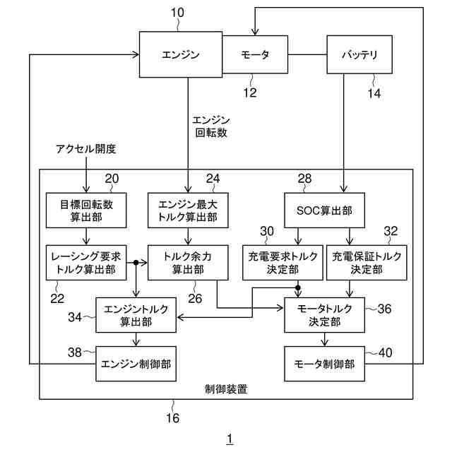 【解決手段】制御装置16において、トルク余力算出部26は、レーシング操作時、アクセル開度から決定されるエンジン10の目標角加速度と、エンジン10が出力可能なトルクと、に基づいてエンジン10のトルク余力を算出する。充電要求トルク決定部30は、バッテリ14のSOCに基づいて、充電要求トルクを決定する。充電保証トルク決定部32は、SOCが小さいほど充電保証トルクが大きくなるように、充電保証トルクを決定する。モータトルク決定部36は、充電要求トルクに基づいてモータ12の発電トルクを決定する。モータトルク決定部36は、充電要求トルクがトルク余力を超える場合、トルク余力が充電保証トルク以上であれば、トルク余力に基づいて発電トルクを制限し、トルク余力が充電保証トルク未満であれば、充電保証トルクに基づいて発電トルクを制限する。