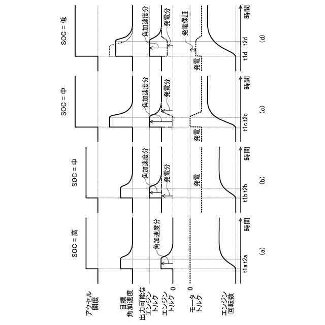 図2(a)は、アクセル開度と到達回転数の関係の一例を示す図であり、図2(b)は、目標回転数の時間変化の一例を示す図であり、図2(c)は、充電要求トルクとSOCの関係の一例を示す図であり、図2(d)は、充電保証トルクとSOCの関係の一例を示す図である。