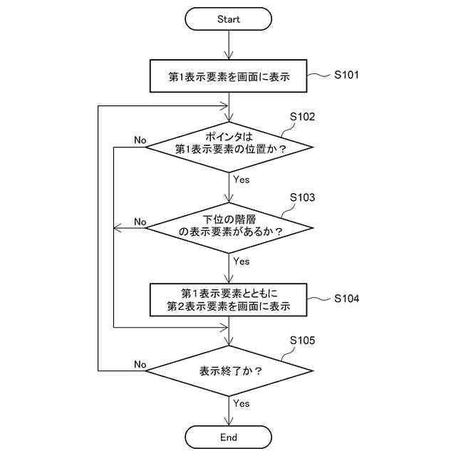 前記画面の前記第1表示要素の位置にポインタが配置されることで、前記第1階層の一つ下の階層である第2階層の表示要素である第2表示要素を前記第1表示要素とともに前記画面に表示する第2表示工程と、