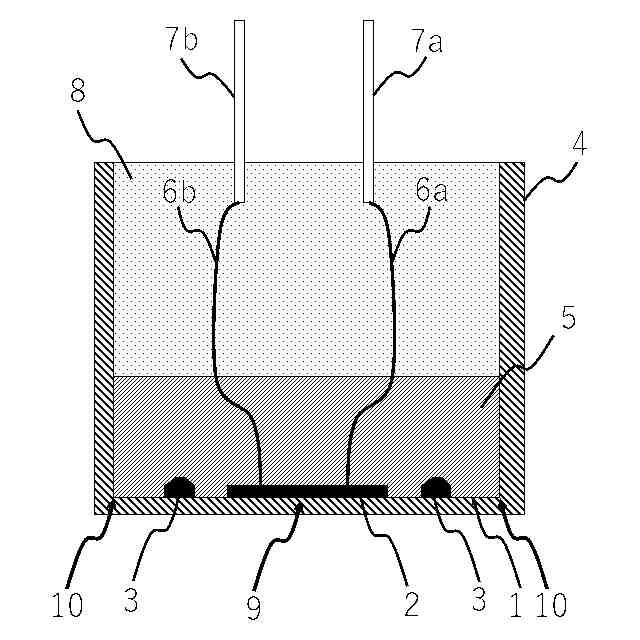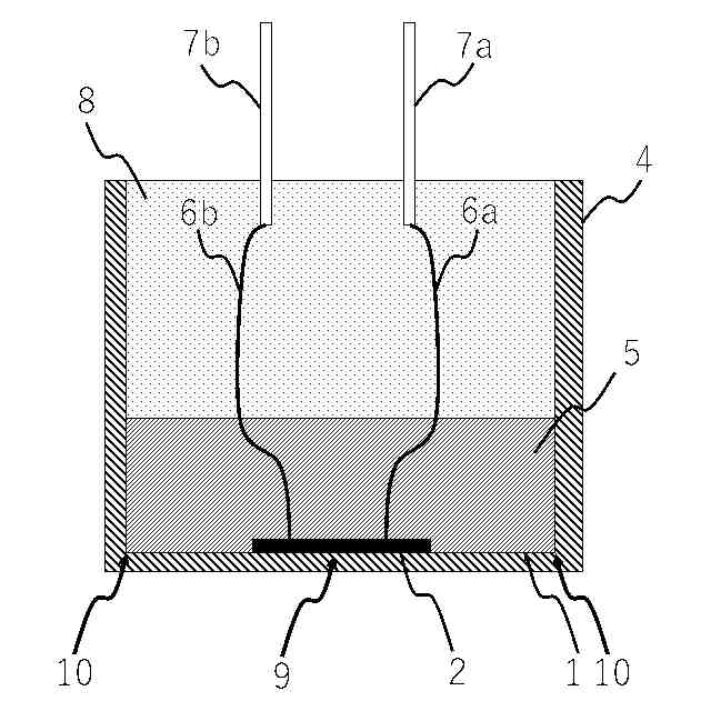 図1は本発明の請求項1に関わる実施形態の超音波センサの構造図の一例である。超音波センサの構成は、アルミ合金からなる有底筒状ケース(4)の内底面に、PZT系セラミックと折り返し電極とを構成に含む圧電素子(2)が接着されておりその横に弾性体(3)が配置される。圧電素子(2)の上に成形されたスポンジまたは発泡シリコーン(5)が配置され、リード線(6a)と(6b)が圧電素子(2)の各電極とピン端子(7a)と(7b)の各端子とが半田付けにより電気的に接続されており、有底筒状ケース(4)内部の開口側をシリコーン樹脂からなる弾性体(8)を充填することにより封止されている。