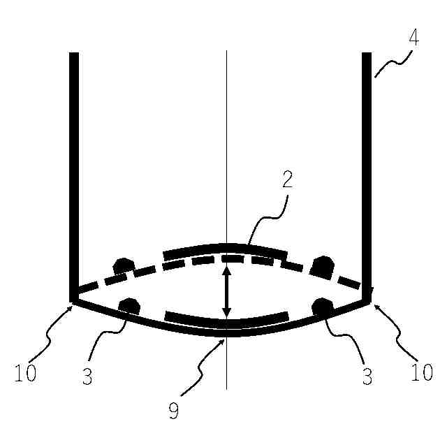 図1に示す本発明の構造において共振周波数と駆動周波数が一致する場合の振動の変位のシミュレーション結果を図8に示す。図8では共振周波数と駆動周波数が一致しており、素子の振動と有底筒状ケースの筐体の振動が同期して、山なりのようになる。