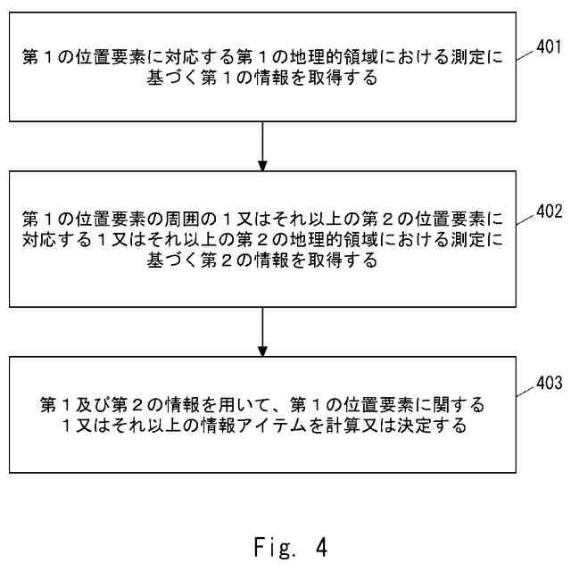 前記第1の位置要素に関連付けられた前記1又はそれ以上の情報アイテムは、前記第1の地理的領域における測定に基づく第1の情報と、前記複数の位置要素に含まれ且つ前記第1の位置要素の周囲の1又はそれ以上の第2の位置要素に対応する1又はそれ以上の第2の地理的領域における測定に基づく第2の情報と、を用いて計算又は決定された情報アイテムである、
