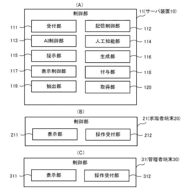 サーバ装置10(制御部11)、求職者端末20(制御部21)、及び管理者端末30(制御部31)によって実現される機能を示すブロック図である。