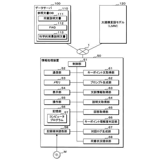 以下、本発明の実施の形態を図面に基づいて説明する。図1は本実施形態の情報処理システムの構成の一例を示す図である。情報処理システムは、情報処理装置50を備える。情報処理装置50は、通信ネットワーク1を介してデータサーバ100、及び大規模言語モデル(LMM:Large Language Models)120に接続されている。