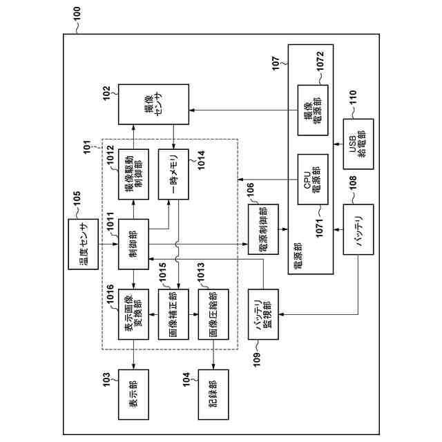 【解決手段】撮像センサが実装された撮像基板と、撮像基板に電力を供給するメイン基板と、メイン基板と、撮像基板とを接続するフレキシブル回路基板と、を備え、メイン基板は、撮像センサが動作する電圧よりも高い第1の電圧をフレキシブル回路基板を介して撮像基板に供給し、撮像基板は、第1の電圧を、第1の電圧よりも低い第2の電圧に変換し、撮像センサに出力する降圧回路を有し、降圧回路は、インダクタを含むDCDCコンバーターである。