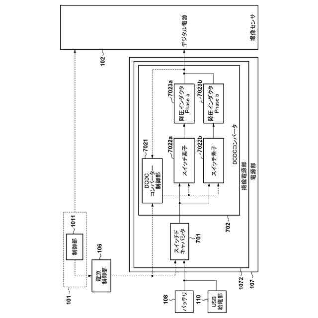 従来の一眼レフカメラやミラーレスカメラといった撮像装置では、撮像センサに電力を供給するDCDCコンバーターは、画像への磁気ノイズの影響を懸念して、撮像センサを実装している撮像基板とは別の基板に配置されている。