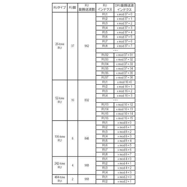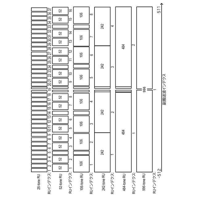 一方、近年、多くの国において無線LANが6GHz帯の周波数を使用できるように法規制の整備が進んでいる。6GHz帯の周波数を使用できることにより、無線LANのスループットが、さらに向上できるようになる。しかし、6GHz帯を使用する場合に求められる送信電力密度の法規制上の許容値は、従来から無線LANにおいて使用されている周波数帯である2.4GHz帯や5GHz帯のそれと比較して小さい。そのため、IEEE802.11bn規格の策定において、6GHz帯を使用する場合の送信電力密度が法規制上の許容値を満たしながら、送信電力を高めるための技術が検討されている。例えば、非特許文献1では、少なくとも一部の副搬送波が周波数軸上で不連続となるように配置された複数の副搬送波により構成されるRUを用いて無線リソースの割当てを行うOFDMA方式が検討されている。このようなRUは、Distributed Resource Unit(DRU)と呼ばれうる。