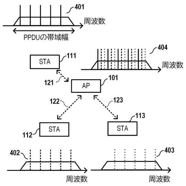 IEEE802.11シリーズ規格では、スループットや周波数利用効率の向上のために直交周波数分割多元接続(OFDMA)方式が用いられている。OFDMAは、Orthogonal Frequency Division Multiple Accessの略語である。OFDMAでは、例えば、通信装置間で使用する周波数チャネルが周波数軸上で分割され、複数のユニットが形成される。それぞれのユニットは、Resouce Unit(RU)と呼ばれる。アクセスポイント(AP)が、それぞれのRUを各ステーション(STA)に割り当てることにより、APと複数のSTAとの間で並行して通信が行われるようになる。これにより、通信システム全体としての周波数利用効率が向上する。