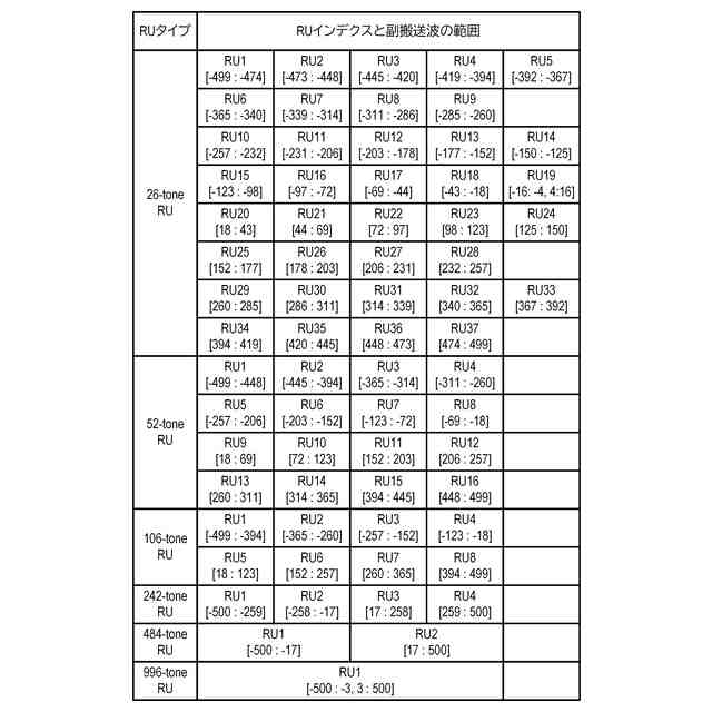 一方、近年、多くの国において無線LANが6GHz帯の周波数を使用できるように法規制の整備が進んでいる。6GHz帯の周波数を使用できることにより、無線LANのスループットが、さらに向上できるようになる。しかし、6GHz帯を使用する場合に求められる送信電力密度の法規制上の許容値は、従来から無線LANにおいて使用されている周波数帯である2.4GHz帯や5GHz帯のそれと比較して小さい。そのため、IEEE802.11bn規格の策定において、6GHz帯を使用する場合の送信電力密度が法規制上の許容値を満たしながら、送信電力を高めるための技術が検討されている。例えば、非特許文献1では、少なくとも一部の副搬送波が周波数軸上で不連続となるように配置された複数の副搬送波により構成されるRUを用いて無線リソースの割当てを行うOFDMA方式が検討されている。このようなRUは、Distributed Resource Unit(DRU)と呼ばれうる。