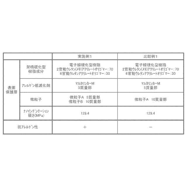 更に、特許文献1では、表面保護層として用いられる硬化型樹脂組成物に、各種添加剤を添加することが記載されている(請求項4等参照)。しかしながら、特許文献1では、表面保護層にそれぞれの添加剤が有する効果を付与する目的で添加されているに過ぎず、アレルゲン低減化剤が示すアレルゲン低減化効果を更に向上させるとの相乗効果により、表面保護層中のアレルゲン低減化剤の添加量が少なくても優れたアレルゲン低減化効果を示すことについては検討されていない。