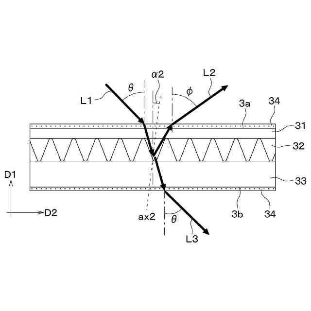 ミラーまたはハーフミラーのなす平面に対する法線方向を厚み方向(D1)とし、ミラーまたはハーフミラーに入射する入射光の進行方向と厚み方向とのなす角度を入射角とし、ミラーまたはハーフミラーで反射した反射光の進行方向と厚み方向とのなす角度を反射角として、