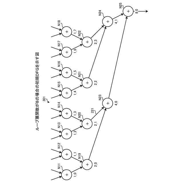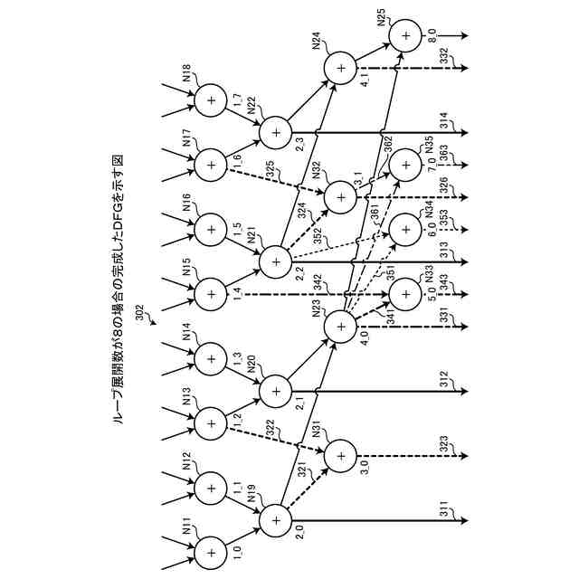 ここで、1つの変数に注目して、ループが繰り返される数をループ数と呼ぶ。そして、DFGにおいて、注目した1つの変数のループをいくつ並列で実行するかを決定して、その分のPEを割り当てることをループ展開数と呼ぶ。