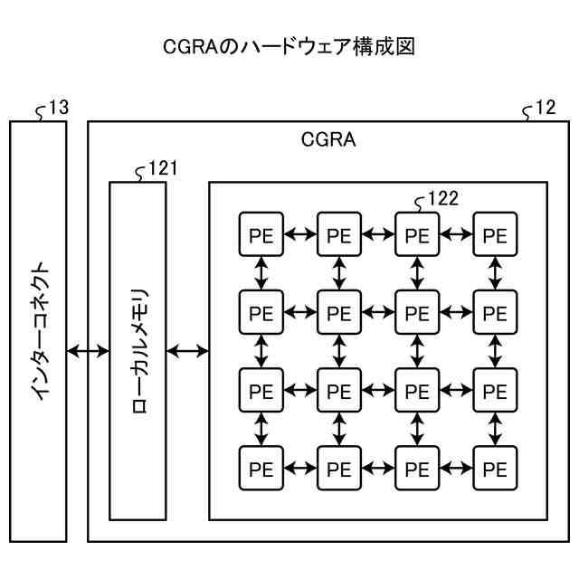 CGRAを用いたプログラムの実行は以下のように行われる。実行するプログラムが、コンパイラを用いてDFG(Data Flow Graph)に変換される。次に、DFGに基づいて、CGRAの各PEの構成に合わせて、各PEが実行する演算内容及びPE間の接続が決定される。この演算内容及びPE間の接続の決定は、マッピングと呼ばれる。その後、マッピングが完了したCGRAにデータが入力されて、GCRAは、入力されたデータを用いて演算を実行する。