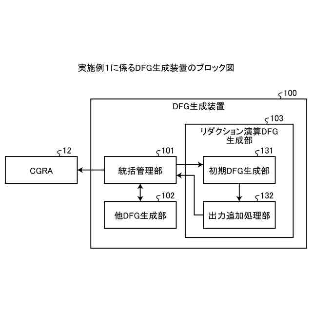 【解決手段】DFG生成装置100は、2つのデータを組として有する複数の演算入力データを基に、2つのデータに対して所定演算を繰り返して演算結果を得るリダクション演算について、使用する演算器、演算器同士の接続経路、及び、演算結果の出力経路を含む演算構成を生成する。DFG生成装置100は、以下の各部を有する。初期DFG生成部131は、演算入力データを直接の入力として所定演算を行う演算器の数であるループ展開数を基に、初期演算構成を生成する。出力追加処理部132は、初期DFG生成部131により生成された初期演算構成に、所定演算を所定の並列度で繰り返す場合の、異なる並列度についての演算結果の出力経路を追加して第1演算構成を生成する。