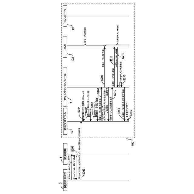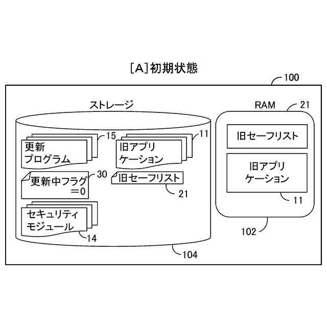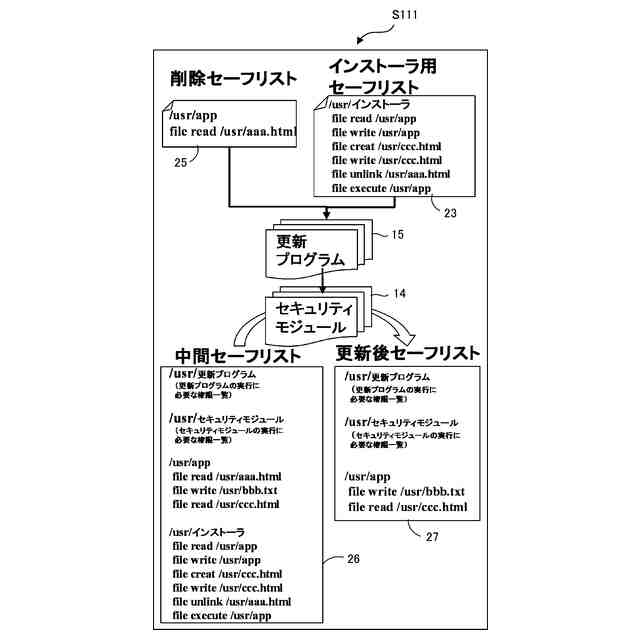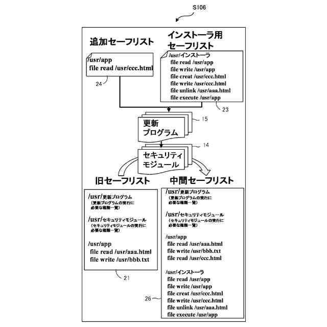 【解決手段】RAM102には、実行が許可されているソフトウェアに関する情報として、更新前のアプリに関する第1の情報を含む第1のセーフリストが保存されている。CPU101は、当該情報として、更新後のアプリに関する第2の情報と、第1のセーフリストに含まれる当該情報から第1の情報を除いた残余の情報とを含む第2のセーフリストを取得する。すると、セキュリティモジュールの管理下で、CPU101は、第1のセーフリストに第2の情報を追加した中間セーフリストを第1のセーフリストに代えてRAM102に保存させた上でアプリを更新し、更新後に、中間セーフリストから第1の情報を削除したセーフリストを中間リストに代えてRAM102に保存させる。