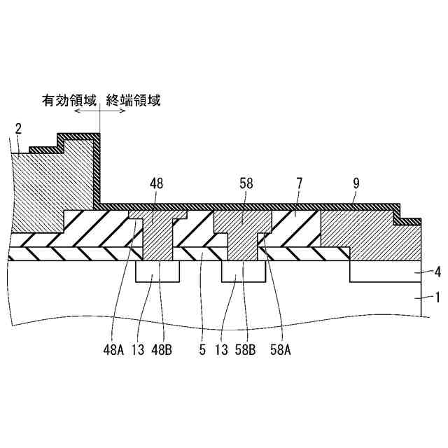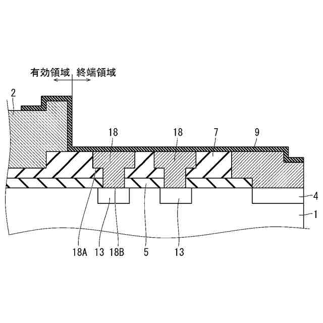 図1は、実施の形態1における半導体装置の構成を示す断面図である。図1においては、半導体装置の上面側の断面構造が示されており、下面側の断面構造は省略されている。半導体装置は、有効領域および終端領域が設けられた半導体基板1を含む。図示は省略するが、半導体装置の平面視において、終端領域は有効領域の周囲に設けられており、その有効領域を取り囲んでいる。