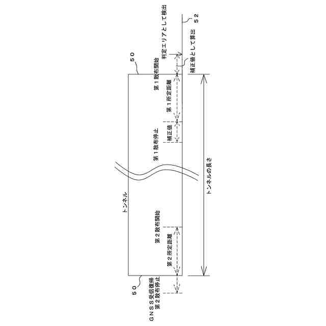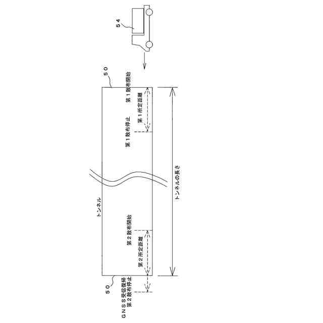 この構成によれば、緯度・経度によらずにトンネル内における第1散布開始位置、第1散布停止位置、第2散布開始位置、及び第2散布停止位置を正確に特定することができる。