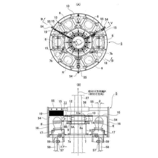 【解決手段】吹付けノズル27の基端部に吹付け方向に対して直交して配置されたベース板7を備えるとともに、このベース板7に対して周方向に適宜の間隔で距離計測器6を複数設置し、これら複数の距離計測器6を覆うために前記ベース板7から離隔して前記距離計測器6からの電波を透過する材料によって形成された円板状の被覆板10を中心軸周りに回転可能に設置するとともに、この被覆板10を回転させる回転手段11を備えた吹付けノズル装置5において、前記距離計測器6としてレーダー距離計を用いるとともに、レーダー距離計6からの電波が前記被覆板10に対して傾斜した入射角度になるように前記レーダー距離計6を傾けて配置する。