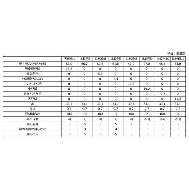 特許文献4の水抽出低変性大豆蛋白質は特殊な殺菌方法が必要であり、汎用的な製造方法とは言えなかった。また特許文献5は大豆に膨化処理等の特殊な処理をする必要があり、製造工程が煩雑になるという課題があった。特許文献6には分離緑豆たん白を用いた麺に関する記載があるが、分離緑豆たん白の製造にはたん白の抽出・分離工程が必要であり、よりコストや環境負荷の低い素材が求められていた。