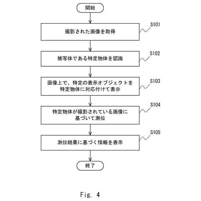 また、本開示に係る第3の態様では、撮影装置により撮影された画像を取得し、前記画像上で、特定の表示オブジェクトを、前記画像で撮影されている特定物体に対応付けて表示させ、前記特定物体が撮影されている画像に基づいて前記撮影装置の位置を測位する、