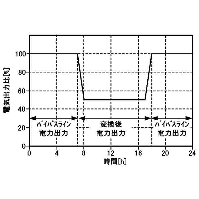 本実施の形態に係る制御装置を有する高速炉の日負荷追従運転時の電気出力比の変化と、変換後電力とバイパスライン電力との切替との関係を示す図である。
