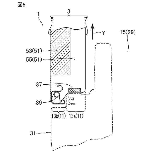 実施の形態5に係る冷蔵庫における、断熱箱体および貯蔵室扉の構造を示す部分断面図である。