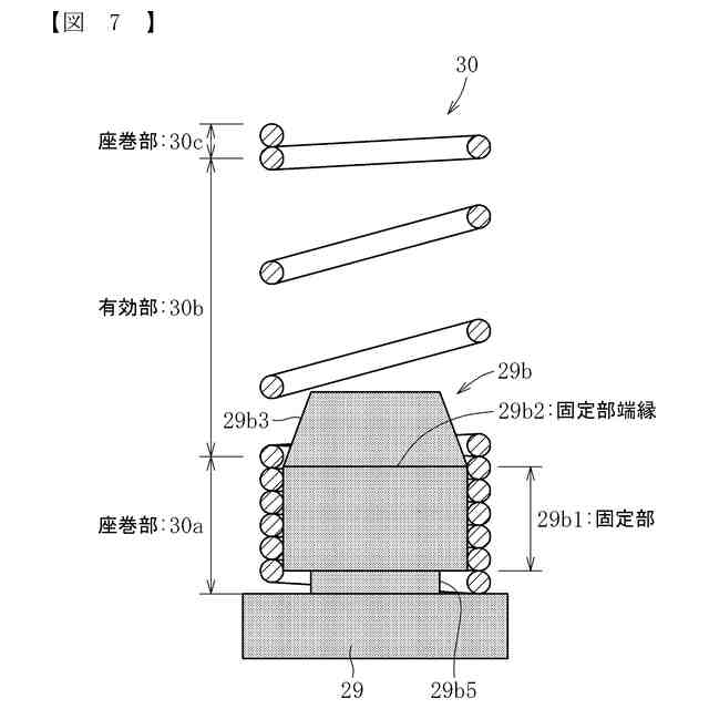 詳しくは図13A、図13Bに示すように、圧縮コイルばね30の一端部に形成された座巻部30aが、ボス部29bの外周面に嵌合される。ボス部29bは、座巻部30aの内径に圧嵌合される円柱状の固定部29b1を有する。固定部29b1の上端縁29b2から先端側に向け縮径したテーパ部29b3や、テーパ部29b3の先端から突き出た円柱状のガイド部29b4を有する場合もある。