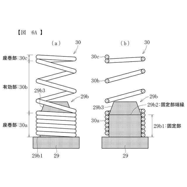 ここで、圧縮コイルばね30の有効部30b(の下端部)が固定部29b1に重なると、図13B(a)⇒(b)のように、有効部30bが固定部29b1を越えた箇所で巻線の傾斜の影響が出る。すなわち、固定部29b1を越えた箇所でモーメントMが発生し、このモーメントMによってばね荷重Pの方向が傾斜したまま圧縮コイルばね30を誤組付けしてしまう場合がある。