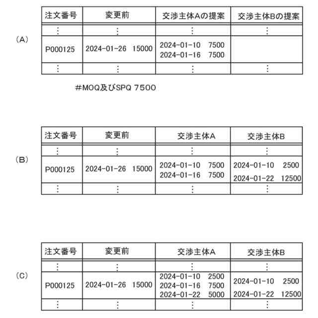 (A)交渉主体Aがオファーを提案したときの注文番号「P000125」についての交渉前の合意案と提案したオファーとの対応を示すテーブルである。(B)交渉主体Bによるカウンターオファーが提案された時点での注文番号「P000125」についての交渉前の合意案と提案されたオファーとの対応を示すテーブルである。(C)交渉主体Bによるオファーに対して交渉主体Aが新たにオファーを提案した時点での注文番号「P000125」についての交渉前の合意案と提案されたオファーとの対応を示すテーブルである。