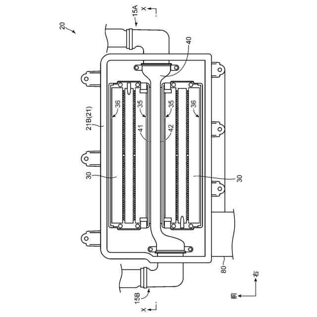 複数のバッテリセルを含むバッテリモジュールでは、バッテリセルどうしの温度にばらつきが生じるとバッテリの充放電能力が低下する。そのため、バッテリモジュールを均一に冷却することが望まれる。しかしながら、特許文献1の構造では、バッテリモジュールに冷却風を分配するチャンバに、その長手方向の一方側の端部から冷却風が導入される。そのため、この構造では、冷却風がチャンバ内をその長手方向の一方端から他方端に向かって移動する。この結果、チャンバの長手方向の他方側の部分ではより多くの冷却風がバッテリモジュールに供給されるものの、一方側の部分ではバッテリモジュールに供給される冷却風が少なく抑えられてしまい、バッテリモジュールを均一に冷却できないおそれがある。