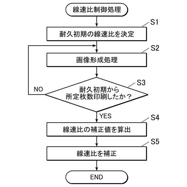 前記制御部は、下記式(1)により耐久初期における線速比θ1を算出し、下記式(2)により前記線速比の補正値Δθを算出する。