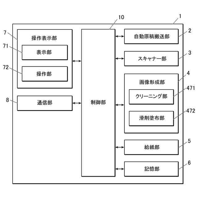 【解決手段】画像形成装置1の制御部10は、耐久初期における滑剤ブラシ47aに滑剤棒47bを初期押圧力により押圧した状態での滑剤ブラシ47aの初期擦過力F1、及び滑剤の削れやすさKに基づいて算出した、耐久初期における像担持体(感光体41)の表面速度に対する滑剤ブラシの表面速度比である線速比θ1により像担持体及び滑剤ブラシ47aを制御し、耐久補正係数γ、初期擦過力F1、耐久末期において滑剤ブラシ47aに滑剤棒47bを初期押圧力より弱い押圧力により押圧した状態での滑剤ブラシ47aの擦過力である末期擦過力F2、及び画像形成部4による印刷枚数に基づいて算出した、線速比の補正値Δθにより線速比θを補正し、耐久末期における滑剤ブラシ47aと滑剤棒47bとの押圧力は、末期擦過力F2と比例関係である。