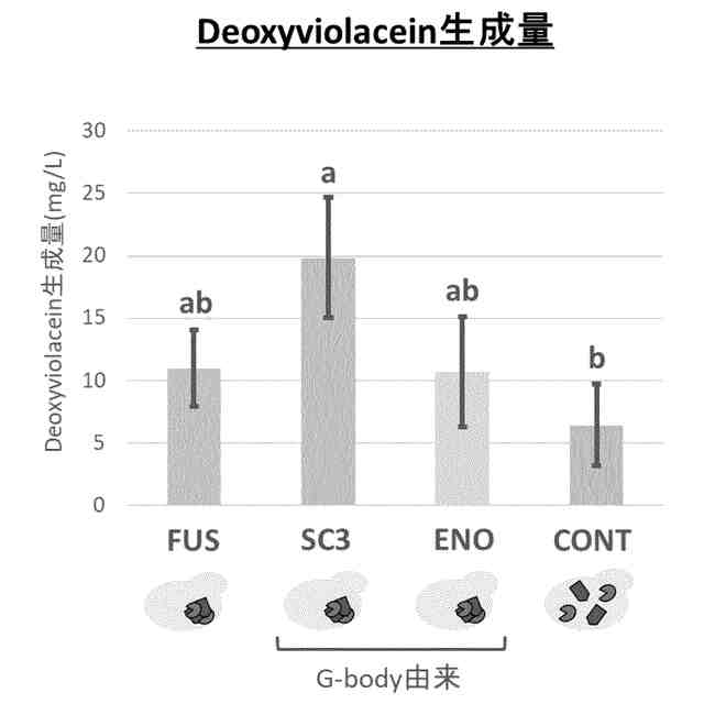 Violacein生成量を1としたときの、Deoxyviolacein生成量の産出結果を示す(n=3、bar=mean±SD、Tukey-test、P<0.05を異なるアルファベットで示した)。