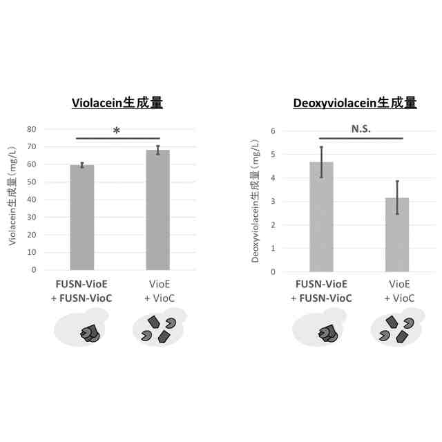 HPLC分析によるViolacein生成量及びDeoxyviolacein生成量の測定結果を示す(n=3、bar=mean±SD、t-test、*P<0.05、N.S.:有意差なし)。