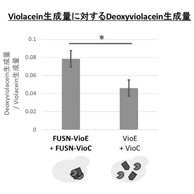 Violacein生成量を1としたときの、Deoxyviolacein生成量の産出結果を示す(n=3、bar=mean±SD、t-test、*P<0.05)。