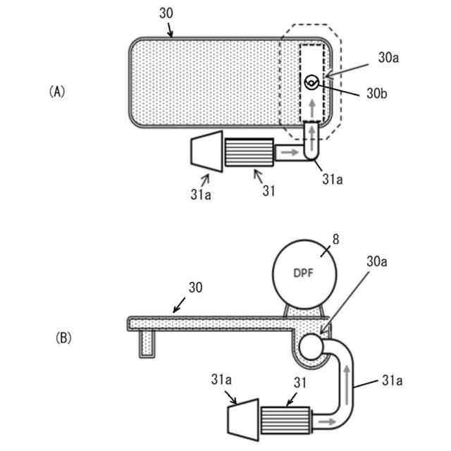 また、フレキシブル配管18の直下に尿素を噴射するドージングユニット19を配置することで、DPF8(エンジン1)からの振動の影響を受けないため、ドージングユニット19の破損防止が図れる。