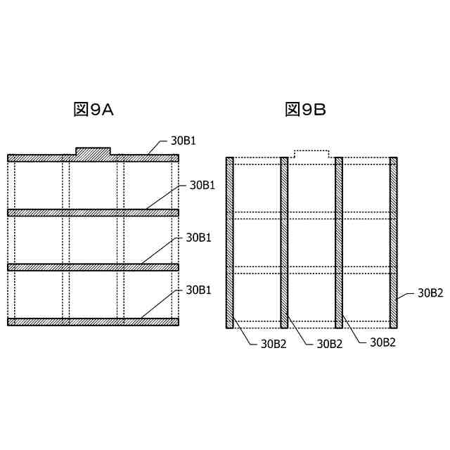 図9A及び図9Bは、それぞれベース電極30Bの第1層30B1及び第2層30B2の平面図である。