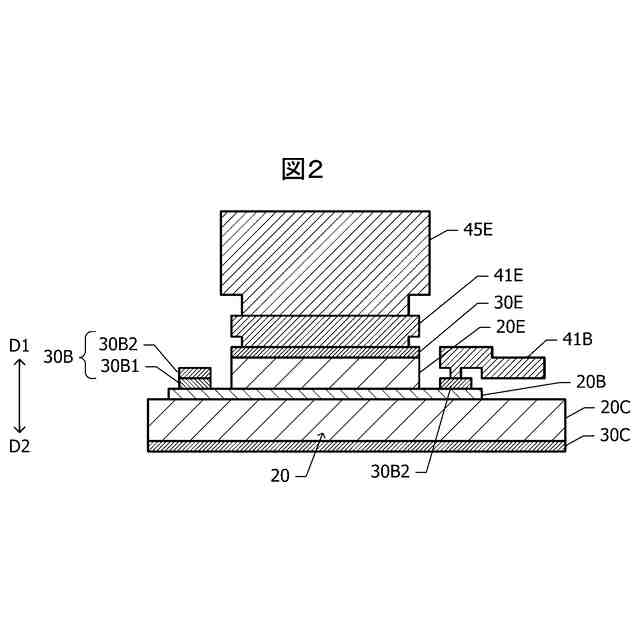 【解決手段】半導体装置は、第1導電型の化合物半導体を含むコレクタ層20Cの第1方向D1を向く面に、第1導電型とは反対の第2導電型の化合物半導体を含むベース層20Bが配置されている。ベース層の、第1方向を向く面の一部の領域に、第1導電型の化合物半導体を含み、ベース層との間にヘテロ接合を形成する少なくとも1つのエミッタメサ20Eが配置されている。コレクタ層の、第1方向とは反対向きである第2方向D2を向く面にコレクタ電極が配置されている。エミッタメサの第1方向を向く面にエミッタ電極30Eが配置されている。ベース層の第1方向を向く面のうち、エミッタメサ20Eが配置されていない領域にベース電極30Bが配置されている。