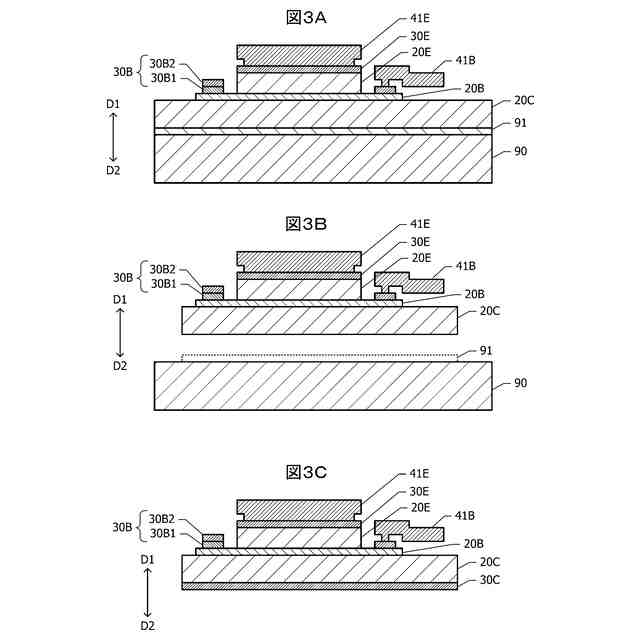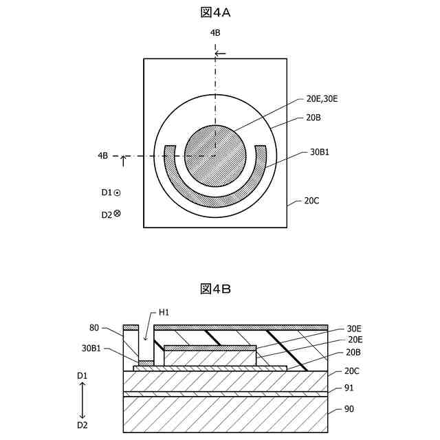 図12A及び図12Bは、それぞれ図11に示した半導体装置のベース電極30Bの第1層30B1及び第2層30B2の平面図である。