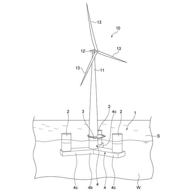 特許文献2には、洋上風力発電施設の基礎構造である半潜水浮体式基礎が記載されている。半潜水浮体式基礎は、風車の支柱を支持するセンターカラムと、センターカラムを中心に間隔をあけて配設された3本のサイドカラムと、センターカラムおよびサイドカラムを互いに接続する3本のビームとを備える。センターカラムは、スラブと、スラブに立設された円筒状の本体部とを備える。本体部は、プレストレスコンクリート製である。
